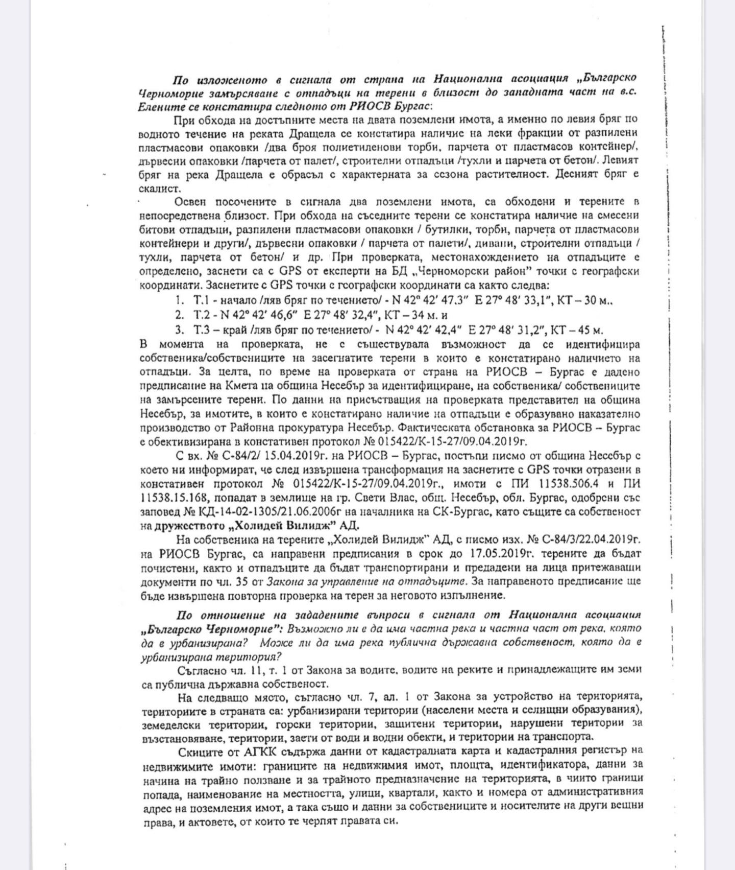 От Асоциацията задават на МОСВ въпроса: „Възможно ли е да има частна река и част от река, която да е урбанизирана територия?“ От ведомството отговарят, че съгласно Агенцията по геодезия, картография и кадастър, поземлен имот с номер 11538.506.3 е частна собственост, урбанизирана територия, с начин на трайно ползване – водно течение, река, с площ 2 687 кв. м. Това означава, че част от река Дращела в комплекс Елените е частна собственост.